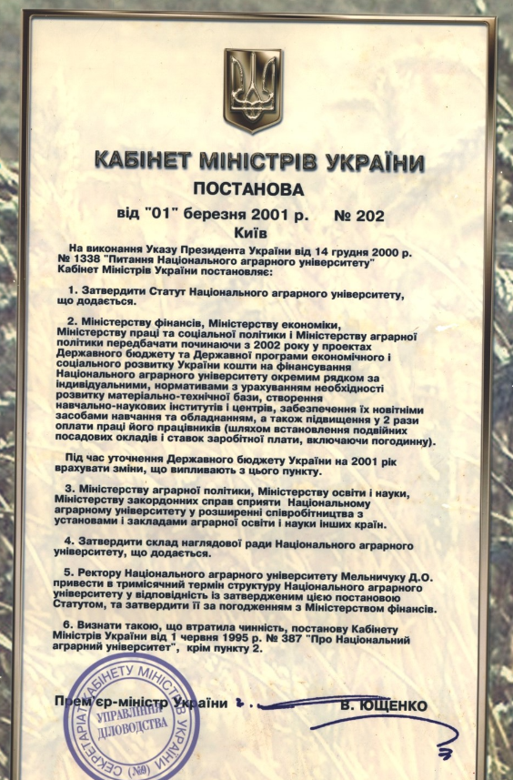 2001 - затвердження Статуту Національного аграрного університету (Постанова Кабінету Міністрів України від 1 березня 2001 року № 202).