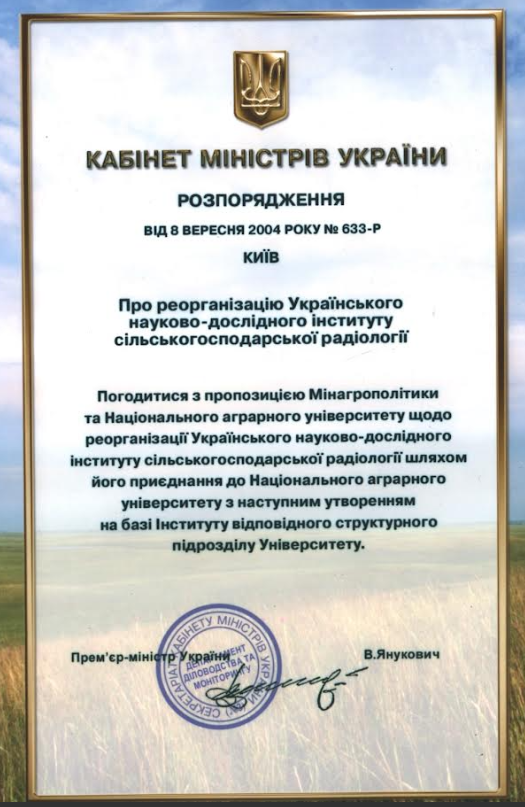 2004 рік - Реорганізація та приєднання до Національного аграрного університету Українського науково-дослідного інституту сільськогосподарської радіології (Розпорядження Кабінету Міністрів України від 8 вересня 2004 року № 633-Р).