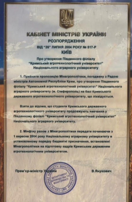 2004 рік - Утворення Південного філіалу "Кримський агротехнологічний університет" Національного аграрного університету (Розпорядження Кабінету Міністрів України від 26 липня 2004 р. № 517-Р).