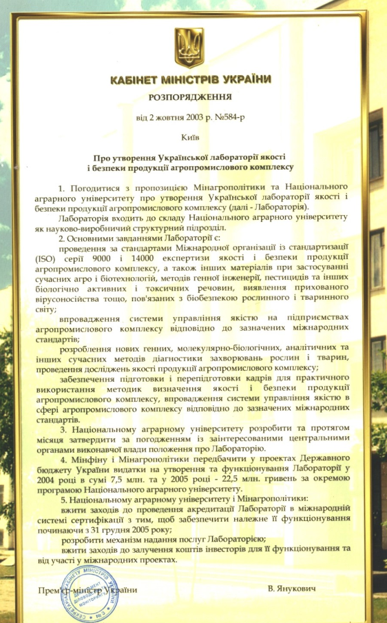 2003 рік - Утворення Української лабораторії якості і безпеки агропромислового комплексу : [у складі Національного аграрного університету] (Розпорядження Кабінету Міністрів України від 2 жовтня 2003 р. №584-р).