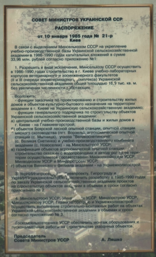 1985 рік - Початок будівництва навчально-лабораторних корпусів ветеринарного та зооінженерного факультетів Української сільськогосподарської академії: [суч. навч.корпус № 12] (Розпорядження Ради міністрів УРСР від 10 січня 1985 р. № 12-р)