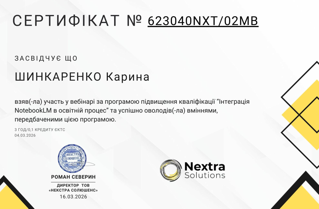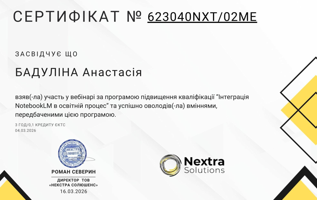 Участь у програмі підвищення кваліфікації «Інтеграці NotebookLM в освітній процес»