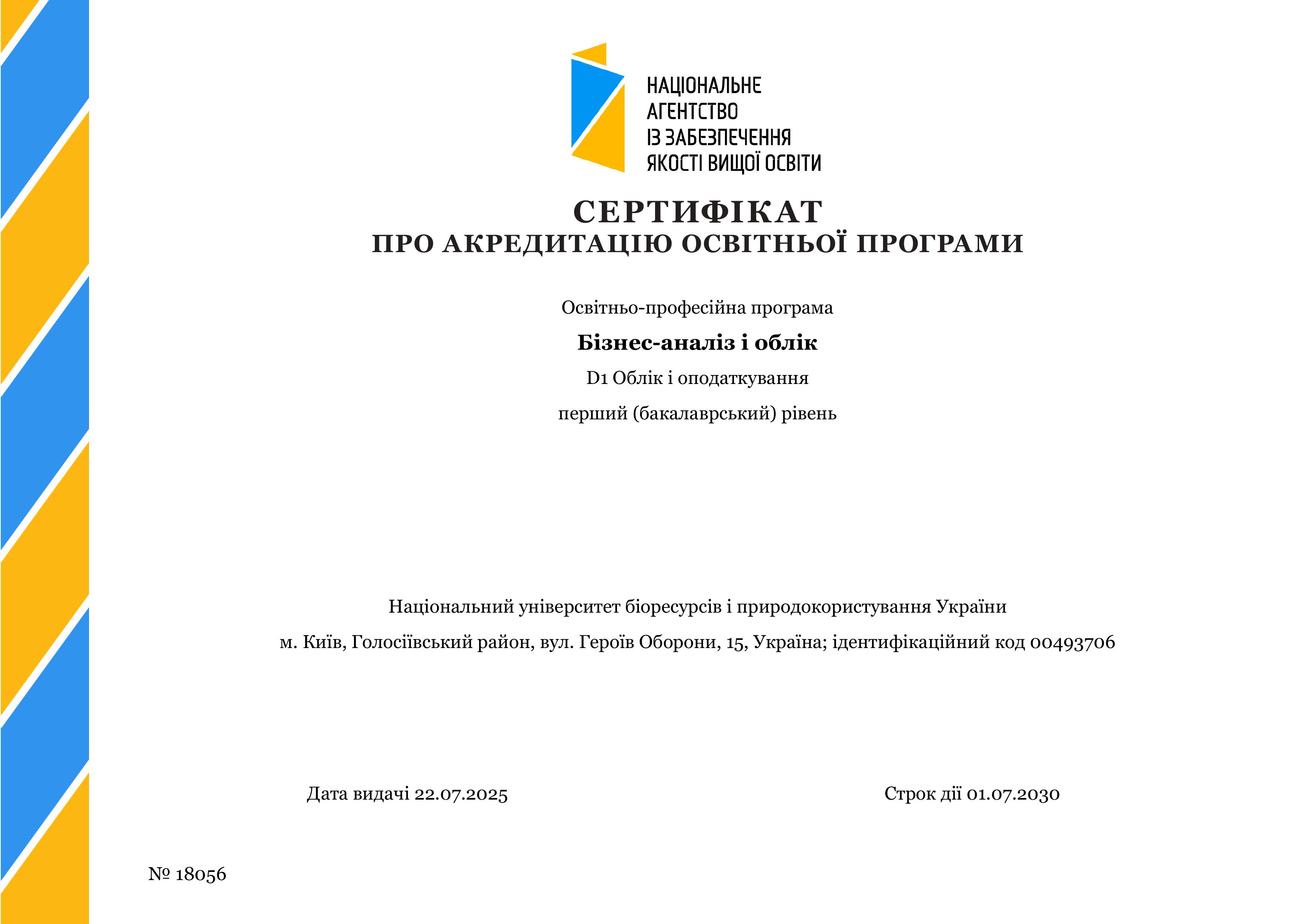 Освітньо-професійна програма «Бізнес-аналіз і облік» забезпечує загальну вищу освіту в галузі знань D «Бізнес, адміністрування та право» спеціальності D1 «Облік і оподаткування».