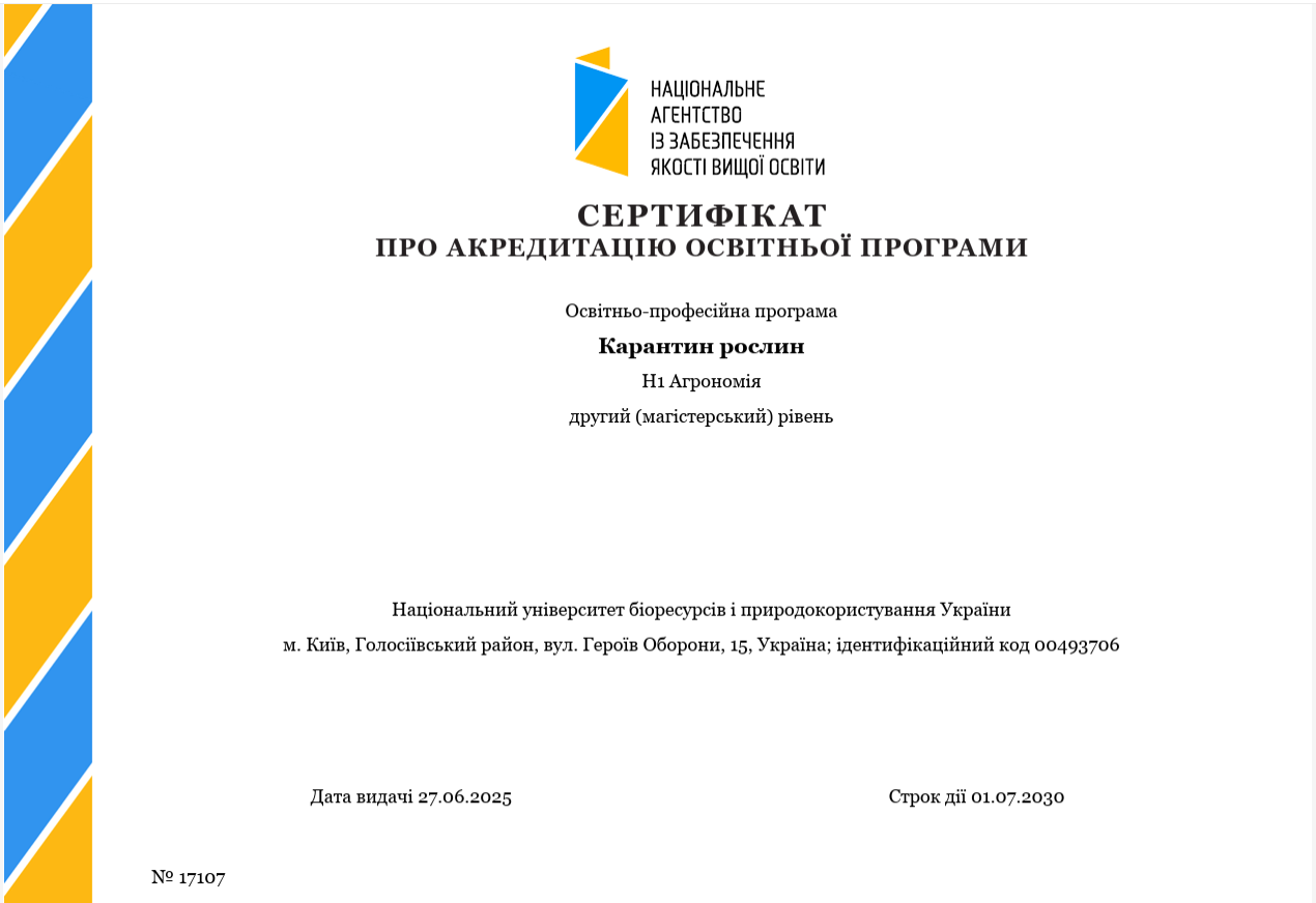 Освітньо-професійна програма «Карантин рослин» другого (магістерського) рівня спрямована на підготовку експертів, здатних забезпечувати фітосанітарну безпеку держави та супроводжувати міжнародну торгівлю рослинною продукцією. Предметна область програми охоплює вивчення біології та екології карантинних і регульованих шкідливих організмів (комах, кліщів, нематод, збудників хвороб та бур’янів), а також опанування методів їх моніторингу, лабораторної діагностики та проведення аналізу фітосанітарного ризику. Практична складова програми фокусується на регламентах митного оформлення вантажів, здійсненні державного контролю, сертифікації продукції згідно з міжнародними стандартами (МСФЗ) та застосуванні сучасних технологій знезараження об’єктів регулювання. Випускники здобувають професійні компетентності для роботи у структурах Державної служби України з питань безпечності харчових продуктів та захисту споживачів, карантинних лабораторіях та провідних агрохолдингах.