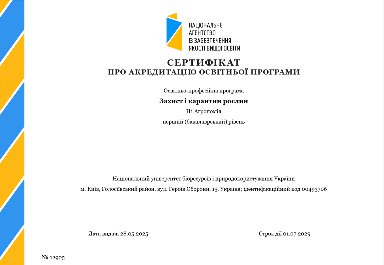 Освітня програма «Захист і карантин рослин» спрямована на підготовку фахівців, які володіють знаннями про біологію шкідників, збудників хвороб і бур’янів та вміють розробляти ефективні заходи їх контролю. Протягом навчання студенти опановують методи фітосанітарного моніторингу, лабораторної діагностики та прогнозування розвитку шкідливих організмів. Особлива увага приділяється практичній підготовці: майбутні бакалаври освоюють цифрові інструменти у захисті рослин, вчаться обґрунтовувати інтегроване застосування сучасних засобів захисту рослин з акцентом на біологічний контроль, вивчають нормативно-правову базу щодо внутрішнього та зовнішнього карантину. Випускники програми затребувані в агрохолдингах, державних фітосанітарних інспекціях, діагностичних лабораторіях і компаніях-дистриб'юторах пестицидів і насіння.