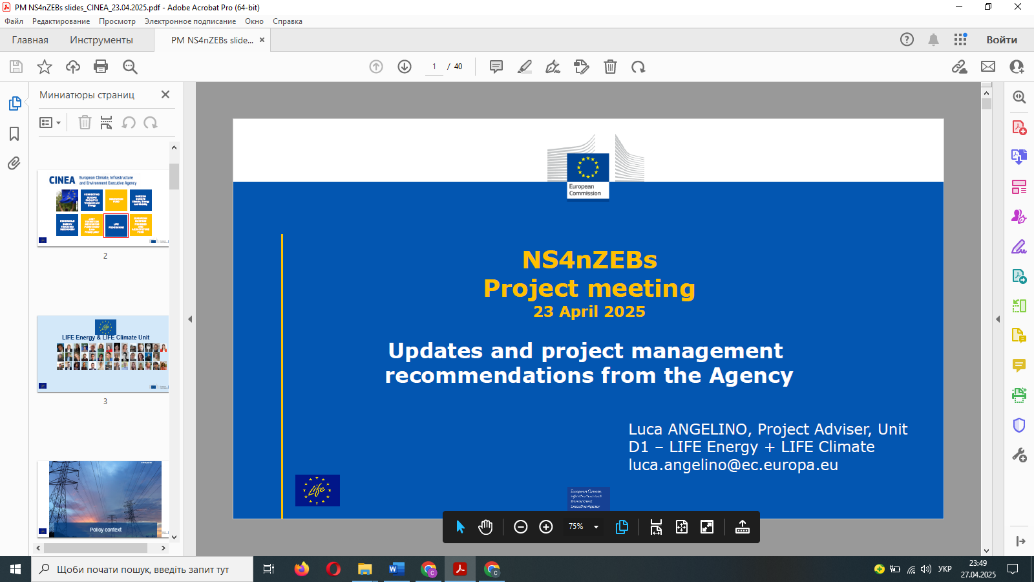 The meeting agenda included the presentation and approval of the interim report with the participation of Luca Angelino, Project Adviser at the European Climate, Infrastructure and Environment Executive Agency (CINEA). Accompanied by presentation materials, the speaker delivered the session “Updates and Project Management Recommendations from the Agency, 2025” and approved the interim results achieved by the Consortium within the framework of the project.