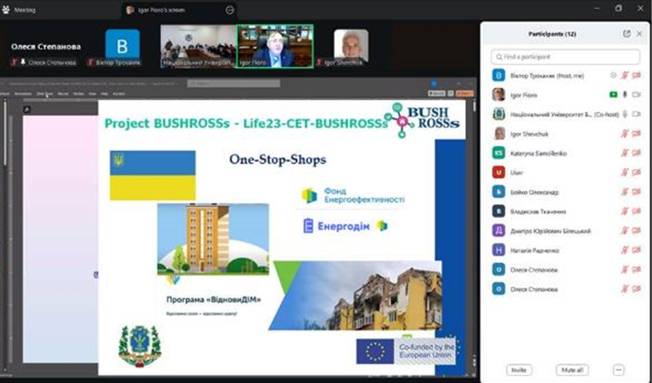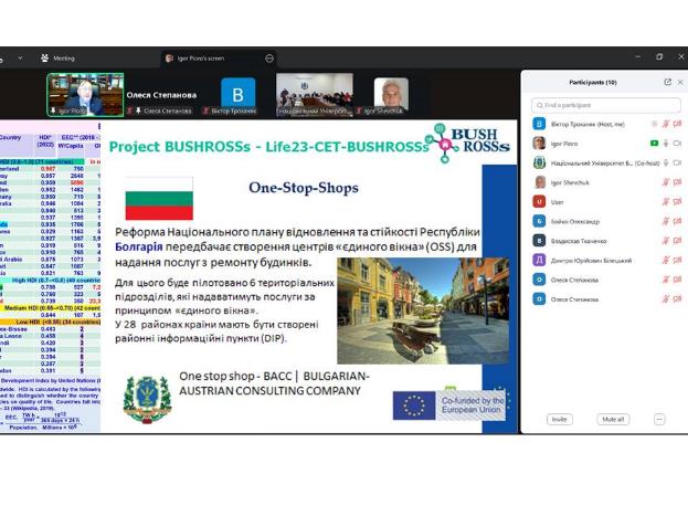 The speakers presented findings on the analysis of local experience as well as specific technical, organizational, and legal conditions that shape the process of residential building renovation in the two partner countries. These results constitute an important component of the LIFE-CET-BUSHROSSs Project and contribute to the development of modern approaches for expanding a network of one-stop shops supporting deep home renovation.