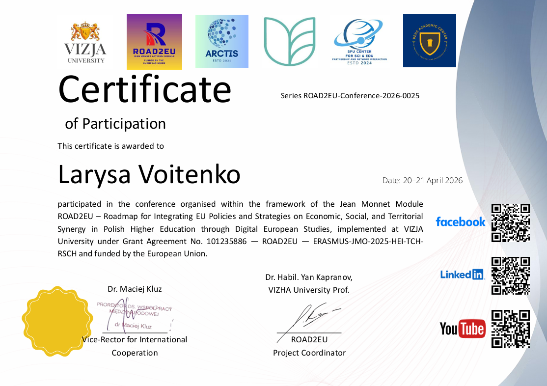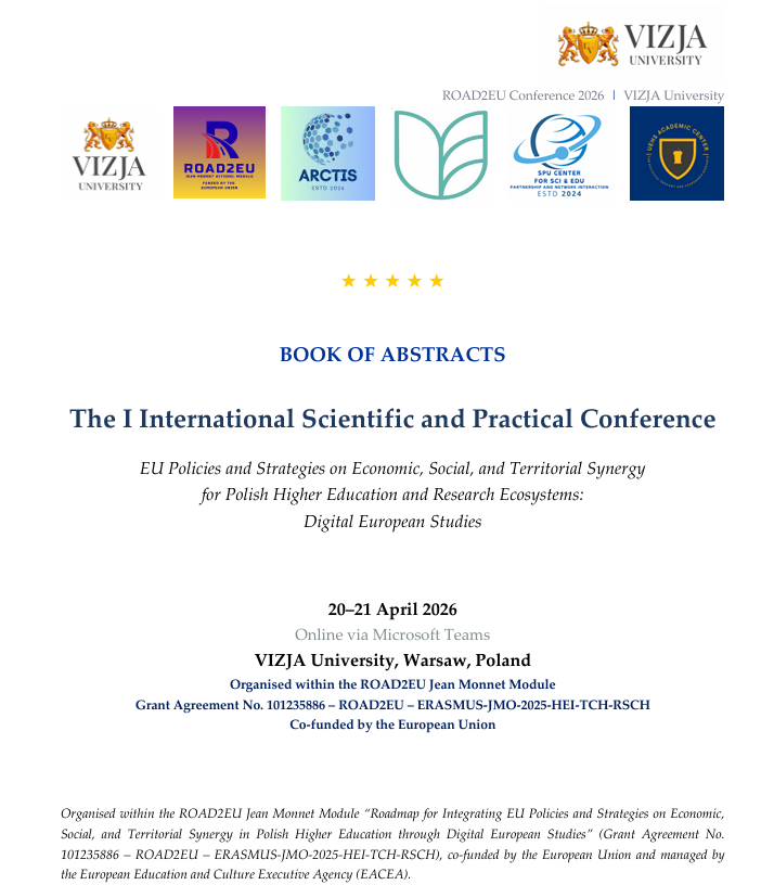 On April 20-21, 2026, the 1st International Scientific and Practical Conference “EU Policies and Strategies on Economic, Social, and Territorial Synergy for Polish Higher Education and Research Ecosystems: Digital European Studies” was held. The event was organized within the framework of the ROAD2EU Jean Monnet Module (Grant Agreement No. 101235886).