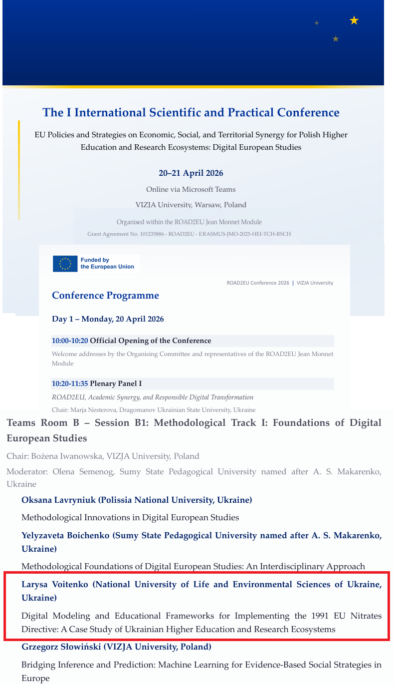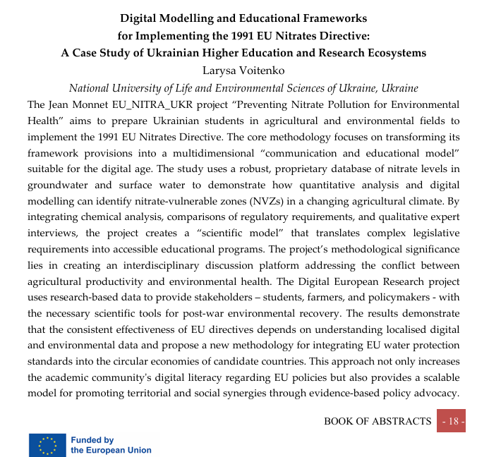 Project Coordinator Larysa VOITENKO participated in the conference, presenting the implementation results of the Jean Monnet project EU_NITRA_UKR - “Preventing Nitrate Pollution for Environmental Health”. The audience showed particular interest in the case study presentation on the Ukrainian higher education ecosystems: the use of proprietary databases and innovative methodologies that allow for the transformation of complex legislative requirements into accessible educational programs. Conference participants noted the high level of the interdisciplinary approach of the EU_NITRA_UKR project, which is critical for Ukraine’s post-war environmental recovery and its successful integration into the European Research Area. Participation is confirmed by a certificate.