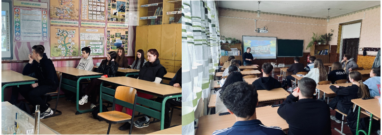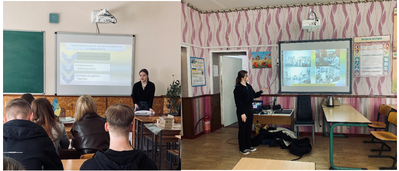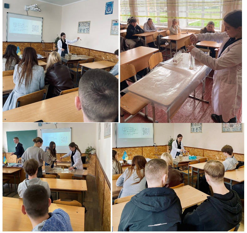 Oksana LOBOTSKA, a 3rd-year student of the Agrobiological Faculty of NUBiP of Ukraine and a laboratory assistant at the Department of Analytical and Bioinorganic Chemistry & Water Quality, conducted a series of large-scale career orientation events from April 20-24, 2026. These sessions were held for graduating students of Lysianka Lyceum №1, Lysianka Lyceum №2, and Boyarka Lyceum in the Cherkasy region. The main goal of the meetings was to popularize natural sciences and introduce young people to the prospects of studying at one of the country's leading universities.