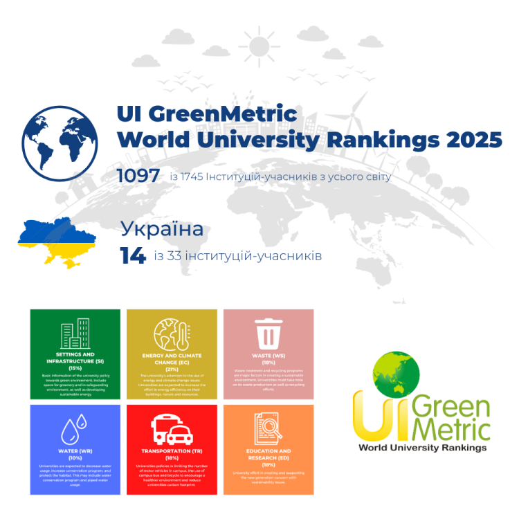 GreenMetric UI rating evaluates universities by a set of indicators covering infrastructure and spatial planning, energy efficiency and climate change response, waste management systems, water use, transport management, and educational and scientific activities in sustainable development. Improving the position of NUBIP of Ukraine in 2025 is associated with the development of a «green» campus, the introduction of energy-saving technologies, the improvement of the waste management system, and the expansion of training courses and research projects aimed at solving environmental challenges.