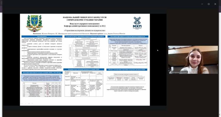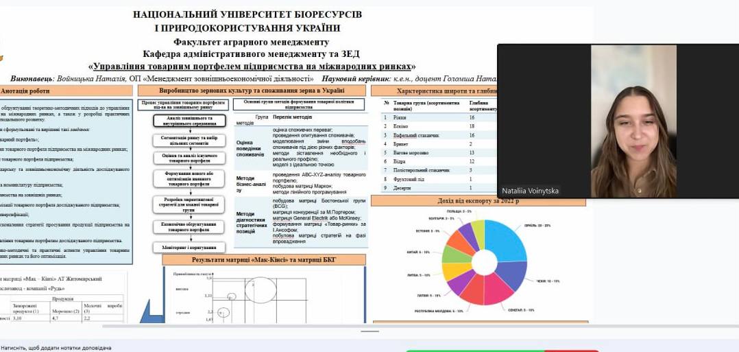 31 жовтня 2025 року у Національному університеті біоресурсів і природокористування України відбулися постерні презентації результатів досліджень здобувачів другого (магістерського) рівня вищої освіти за спеціальністю 073 «Менеджмент» освітньої програми «Менеджмент зовнішньоекономічної діяльності». Захід проведено відповідно до «Положення про підготовку і захист магістерської кваліфікаційної роботи», яке визначає, що участь у постерній конференції є обов’язковою умовою допуску здобувача до захисту магістерської роботи перед екзаменаційною комісією.
