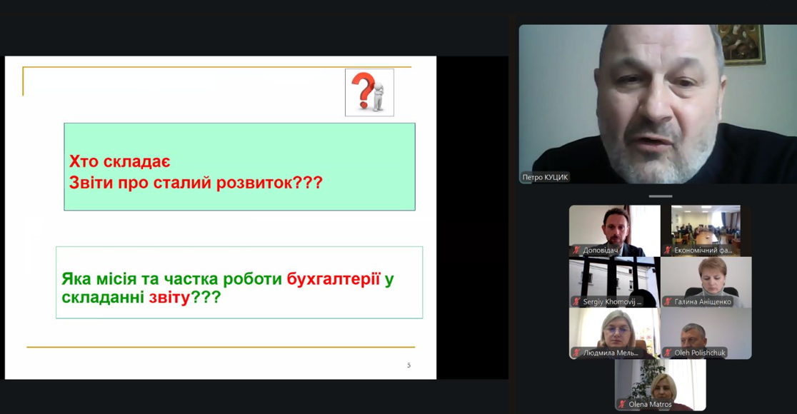 Ректор Львівського торговельно-економічного університету професор Петро КУЦИК представив тему «Розкриття інформації про ризики у звітності про сталий розвиток», а професор Національної академії статистики, обліку та аудиту Володимир ШЕВЧУК — «Розвиток облікової науки – відповідь на виклики воєнного та повоєнного періодів».