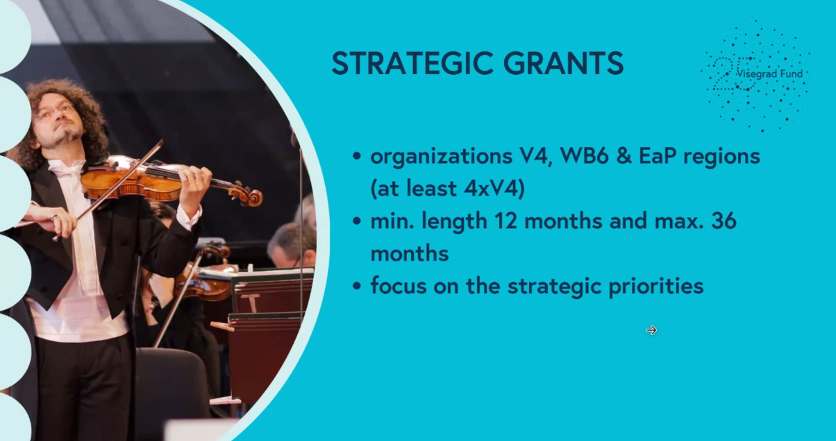 У межах семінару представниця Вишеградського Фонду висвітлила особливості стратегічних грантів Вишеградського фонду, зокрема вимоги до заявника, відповідність напрямку діяльності та дотримання стратегічних пріоритетів програми. Було наголошено, що в таких проєктах мають брати участь щонайменше чотири країни, а тривалість реалізації може сягати до 36 місяців. Крім того, спікерка детально зупинилася на вимогах та правилах участі у Вишеградських грантах і Вишеград+ грантах.