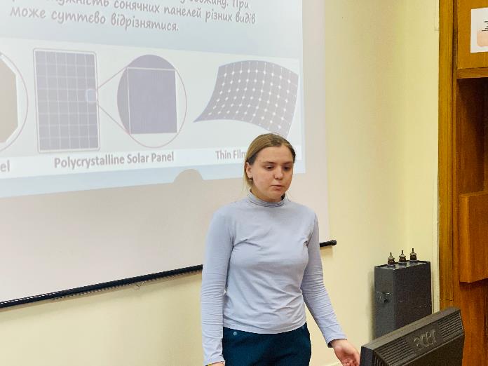 An interesting report on the topic: "Solar panels in space and on the ground" accompanied by presentation material was presented. Natalia Shyroka, 1st year student (supervisor, Ph.D., Assoc. Prof. Оlena Shelimanova).