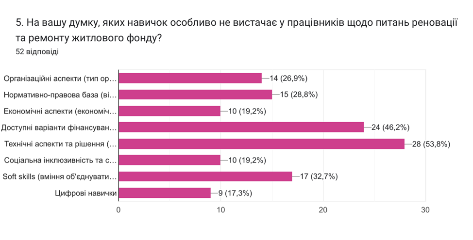 Among the skills that employees lack in terms of home renovation and repair, technical solutions (53.8%), project financing options (46.2%), and 32.7% were most often indicated.