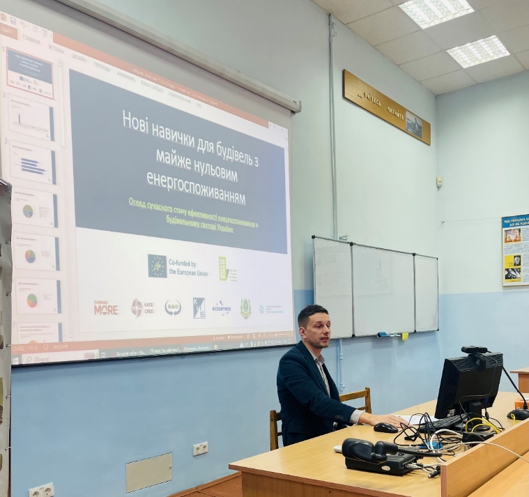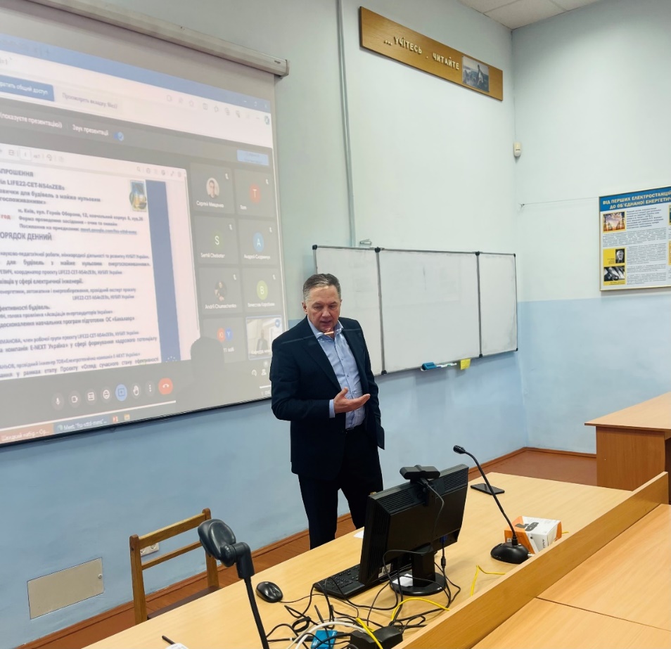 In the Educational and Research Institute of Energetics, Automatics and Energy Saving hosted a Round table dedicated to the implementation the tasks of Project LIFE22-CET-NS4nZEBs «New Skills for Nearly Zero Energy Buildings». The project is aimed at training and retraining specialists in the use of smart photovoltaic, thermal, hydrogen systems in buildings at all levels of design, operation and maintenance. International and Ukrainian partners were invited to the event, namely: THOMAS MORE KEMPEN, SOFIA ENERGY CENTRE, Association of Energy Auditors of Ukraine, LTD «Electrotechnical company E-NEXT Ukraine».
