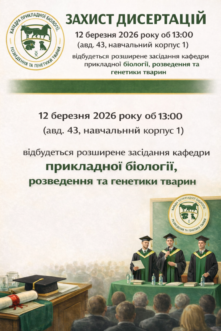 12.03.2026 року об 13:00 (авд. 43, навчальний корпус 1) відбудеться розширене засідання кафедри прикладної біології, розведення та генетики тварин