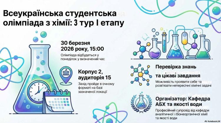 Запрошуємо вас взяти участь у 3 турі першого етапу Всеукраїнської студентської олімпіади з хімії.