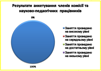 Анкетування студентів та науково-педагогічних працівників, що відвідали лабораторне заняття, підтвердили високий професійний рівень викладача. Присутні на занятті відмітили його актуальність, сучасність і доступність змісту для студентів, високий науковий рівень володіння матеріалом і різноманітність методів та прийомів його подання, а також використання технічних засобів навчання.