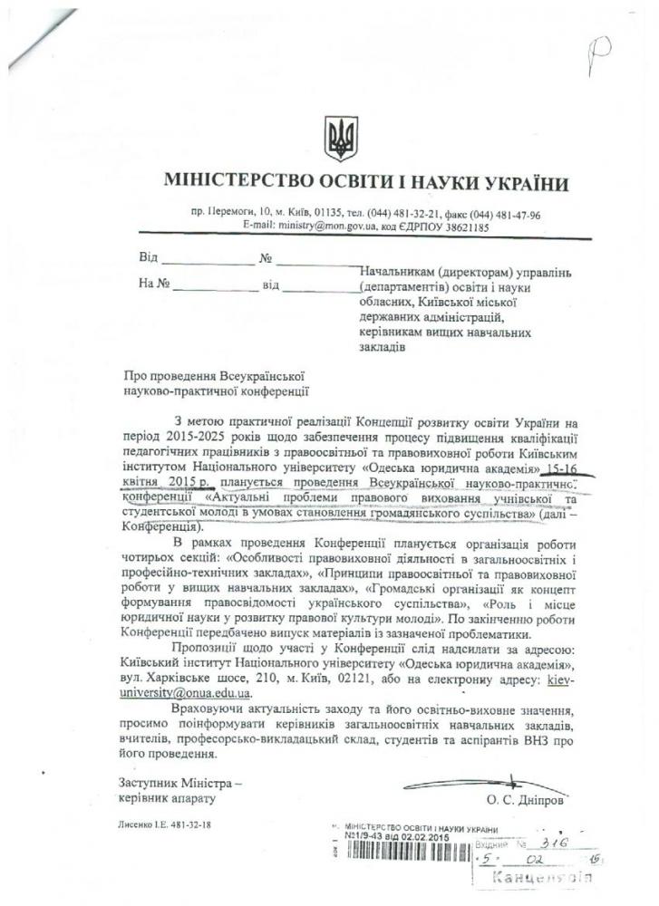 15-16 квітня 2015 року у Київському інституті Національного університету "Одеська юридична академія" відбудеться Всеукраїнська науково-практична конференція "Актуальні проблеми правового виховання учнівської та студентської молоді в умовах становлення громадянського суспільства".