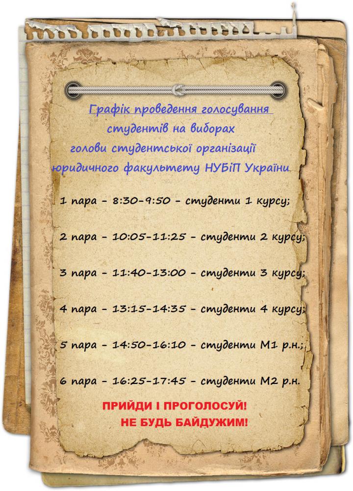 Графік проведення голосування на виборах голови студентської організації юридичного факультету 29 вересня 2015 року 03:00 - 03:00