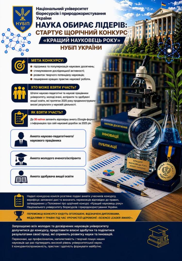 Анкета науково-педагогічного/наукового працівника для участі у щорічному конкурсі «Кращий науковець року» НУБіП України (інформація про науковий доробок за 2025 рік):