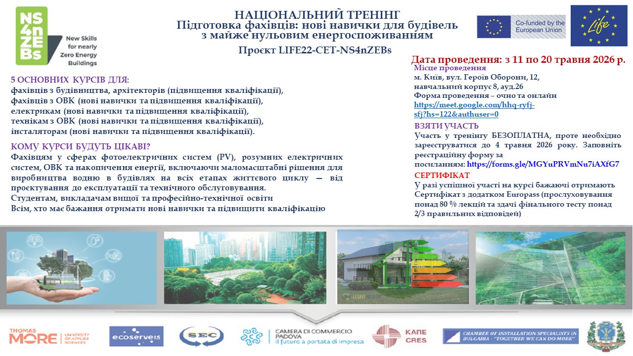 НАЦІОНАЛЬНИЙ ТРЕНІНГ. Підготовка фахівців: нові навички для будівель з майже нульовим енергоспоживанням НАЦІОНАЛЬНИЙ ТРЕНІНГ. Підготовка фахівців: нові навички для будівель з майже нульовим енергоспоживанням 28 квітня - 20 травня 2026 року 09:00 - 00:08 Формат: Очна та дистанційна Місце проведення: м. Київ, вул. Героїв Оборони, 12, навчальний корпус 8, ауд.26 Реєстрація