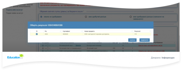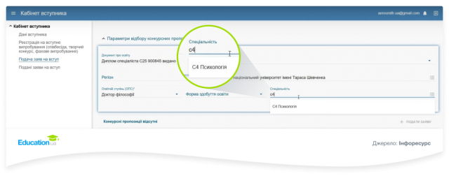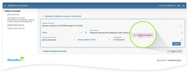 У параметрах відбору заповніть необхідні поля: документ про освіту, на базі якого вступаєте; заклад освіти – для швидкого пошуку почніть вводити назву потрібного закладу, а далі в спадному списку оберіть університет; освітній ступінь, на який вступаєте, – доктор філософії/доктор мистецтва; форма здобуття освіти; спеціальність – шукайте за кодом або назвою (наприклад, А1 «Освітні науки»). Після цього натисніть на синю кнопку «Пошук».Крок 3. У списку оберіть потрібну Вам конкурсну пропозицію. Система запропонує Вам перелік, де потрібно обрати потрібну Вам конкурсну пропозицію, виділивши її позначкою. Далі натисніть на червону кнопку «Подати заяву».Крок 4. Заповніть необхідні поля в картці конкурсної пропозиції.Джерело фінансування: на бюджет – верхня позначка; на контракт (для небюджетної конкурсної пропозиції) – нижня позначка.Усього Ви можете подати 15 заяв на вступ, 5 з яких – на бюджет. Нагадаємо, що вступ на бюджет до аспірантури можливий лише на денну форму навчання. Обраний освітній ступінь за бюджетні кошти: ніколи не здобувався – якщо вступаєте в аспірантуру вперше; вже здобутий раніше – якщо вже колись вчились в аспірантурі на бюджеті й отримали диплом; вже здобувався раніше (навчання не завершено) – якщо вступали, але не довчилися та не отримали диплом.Результати випробувань. У стовпчику «Внесений результат випробування» натисніть на червоні посилання та внесіть потрібну інформацію, зокрема про ЄВІ/ЄВВ. Орієнтуйтеся на підказки, які дає система. Якщо Ви все виконаєте правильно, то червоні посилання будуть світитися зеленим кольором.Крок 5. Ознайомтеся з вимогами до мотиваційного листа. У стовпчику «Назва випробування» оберіть «Мотиваційний лист» та натисніть на посилання поруч із ним «Вимоги». Після ознайомлення з вимогами до структури та змісту мотиваційного листа, закрийте інформаційне віконце, натиснувши синю кнопку «Відмінити».Крок 6. Внесіть текст свого мотиваційного листа. У стовпчику «Внесений результат випробування» натисніть на перше червоне посилання «Внести текст мотиваційного листа». У поле, що відкрилося перед Вами, вставте скопійований текст свого мотиваційного листа. Файл завантажувати не потрібно – для цього в кабінеті не передбачено такого функціонала.Перечитайте уважно внесений текст та натисніть кнопку «Зберегти». Врахуйте, що редагувати текст мотиваційного листа можна до моменту подання заяви.Якщо Ви хочете додати до мотиваційного листа матеріали, які підтверджують викладену інформацію (наприклад, копії сертифікатів), то можете це зробити окремим листом на електронну пошту відділу аспірантури, докторантури та атестації наукових кадрів Національного університету біоресурсів і природокористування України. Мотиваційний лист потрібно додавати до кожної заяви.Крок 7. Перевірте внесену інформацію. Якщо Ви все вказали правильно, натисніть на синю кнопку «Подати заяву». Уважно прочитайте попередження, яке відкриється перед Вами, та натисніть кнопку «Підтвердити».Крок 8. Перегляньте створену заяву. Це можна зробити в модулі «Подані заяви на вступ». Коли Університет опрацює Вашу заяву, вона отримає статус «Зареєстровано у закладі освіти».За таким самим принципом подайте наступні заяви.  За матеріалами сайту Education.ua
