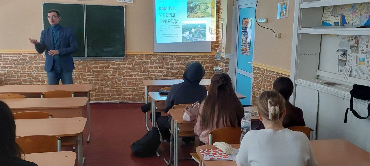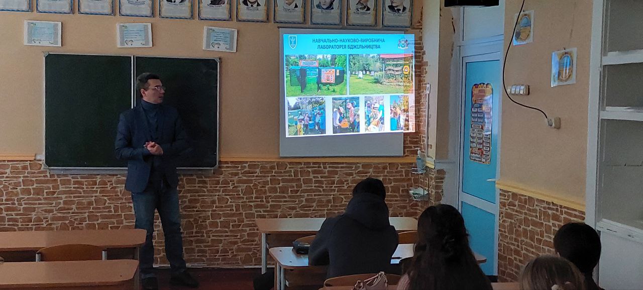 Під час зустрічі з учнями 11 класу Дмитро Уманець детально ознайомив присутніх із діяльністю Національного університету біоресурсів і природокористування України, його структурою, освітніми програмами та сучасними напрямами підготовки фахівців. Особливу увагу було приділено факультету тваринництва та водних біоресурсів, який здійснює підготовку спеціалістів для галузей тваринництва, рибництва та бджільництва відповідно до європейських стандартів освіти.