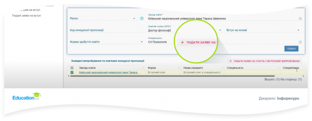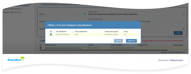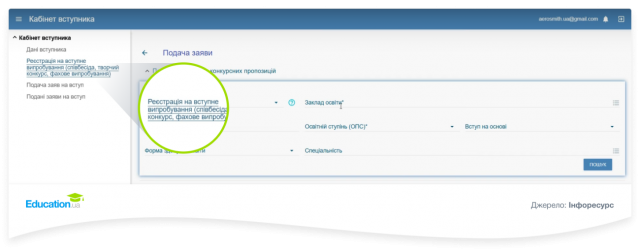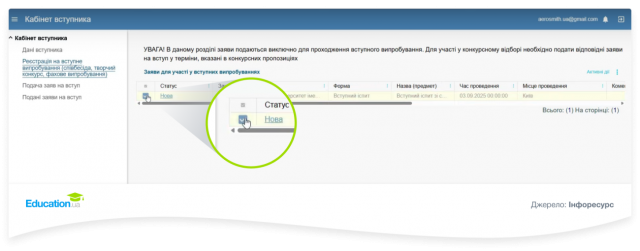 Реєстрація на вступний іспит зі спеціальності: покрокова інструкція для вступників до аспірантури Крок 1. Зайдіть у свій кабінет на сайті ЄДЕБО. Для входу використовуйте логін і пароль, які вказували при реєстрації.У меню ліворуч оберіть розділ «Реєстрація на вступне випробування (співбесіда, творчий конкурс, фахове випробування)».Крок 2. Натисніть на кнопку «Активні дії» та оберіть «Додати». Перед Вами відкриється вікно, де потрібно заповнити поля: заклад освіти; код конкурсної пропозиції – дивіться в розділі з конкурсними пропозиціями за допомогою пошукових фільтрів. У цьому Вам допоможуть пояснення щодо пошуку конкурсних пропозицій на сайті ЄДЕБО; освітній ступінь – доктор філософії/доктор мистецтв; вступ на основі – спеціаліст/магістр; форма здобуття освіти; спеціальність. Після цього натисніть синю кнопку «Пошук».Крок 3. Подайте заяву на участь у вступному випробуванні.Оберіть потрібну конкурсну пропозицію, поставивши «пташку» у відповідному квадратику в блоці «Знайдені випробування та пов’язані конкурсні пропозиції». Далі натисніть червону кнопку «Подати заяву на участь у вступному випробуванні». Оберіть одну із запропонованих дат для складання випробування й натисніть «Обрати».Крок 4. Відстежуйте статус заяви. Усі Ваші подані заяви на вступні випробування будуть збережені в розділі «Реєстрація на вступне випробування (співбесіда, творчий конкурс, фахове випробування)», де Ви бачитимете час і місце його проведення.Зверніть увагу, що заяви на участь у вступних випробуваннях не є заявами на вступ, тобто на участь у конкурсному відборі до аспірантури. Останні потрібно подавати окремо в блоці «Подача заяв на вступ» з 03 вересня.  За матеріалами сайту Education.ua