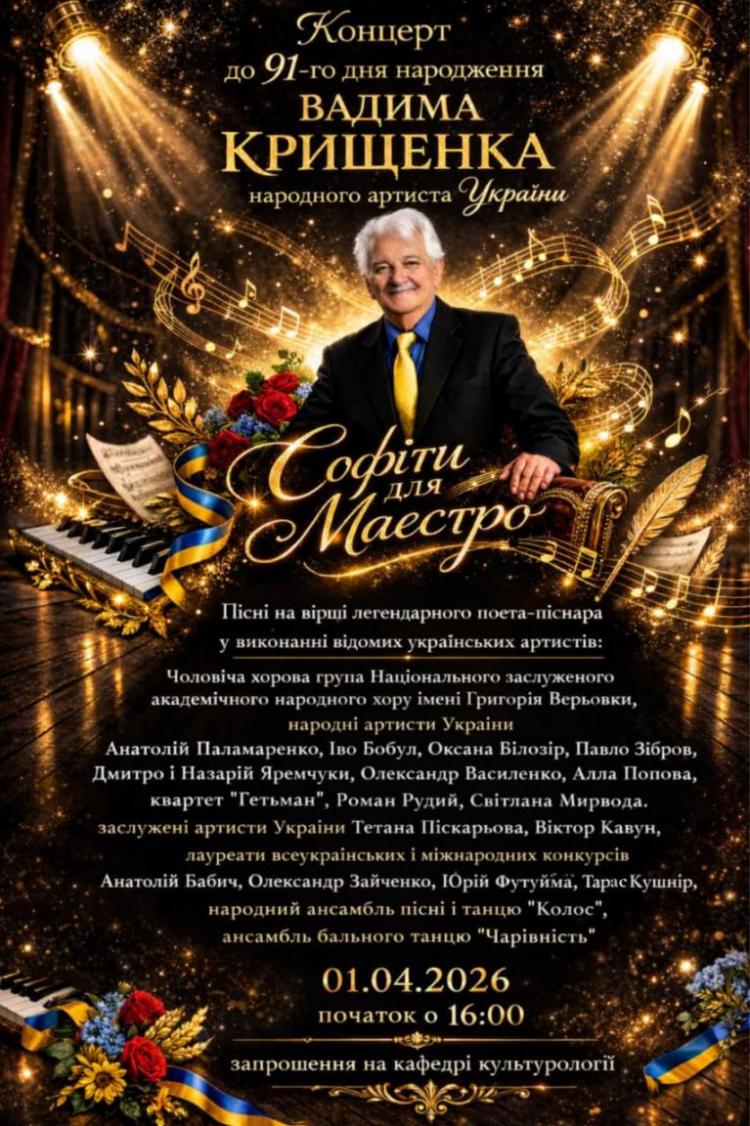 Кафедра культурології щиро запрошує на творчий вечір з нагоди 91-річчя професора кафедри народного артиста України, заслуженого працівника культури, заслуженого діяча мистецтв України, члена Національної Спілки письменників України, лауреата багатьох літературно-мистецьких премій, автора понад 1000 пісень, кавалера багатьох державних і церковних нагород Вадима Дмитровича КРИЩЕНКА «Софіти для маестро».