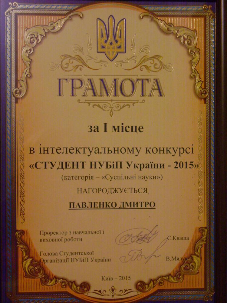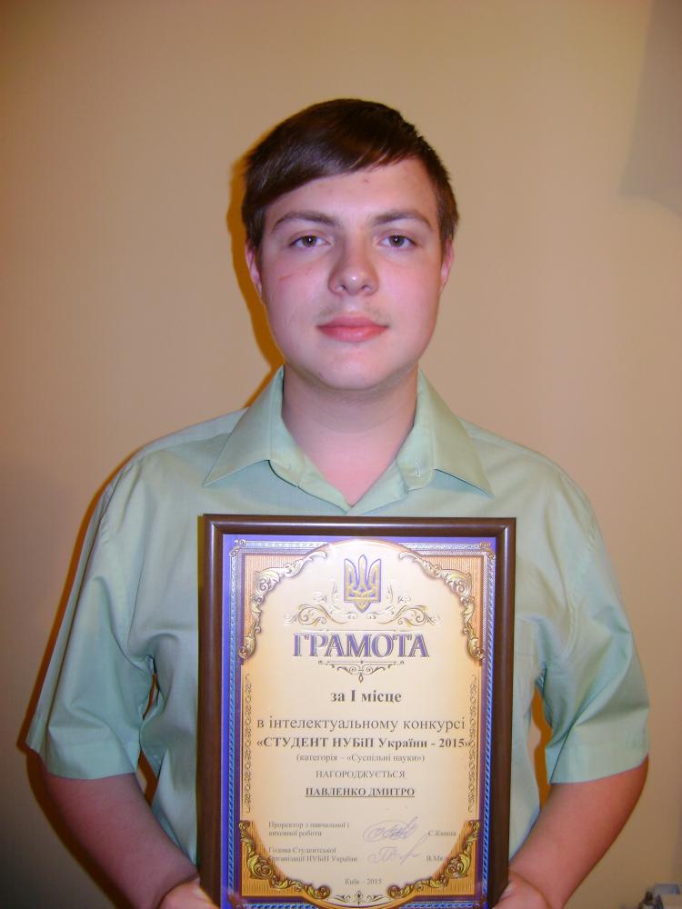 Протягом березня – травня 2015 року в Національному університеті біоресурсів і природокористування України проводився інтелектуальний конкурс «Студент НУБіП – 2015» у номінаціях «Суспільні науки», «Природничі науки» та «Технічні науки». У конкурсі приймали участь студенти НУБіП України серед яких був і першокурсник юридичного факультету Дмитро Павленко.