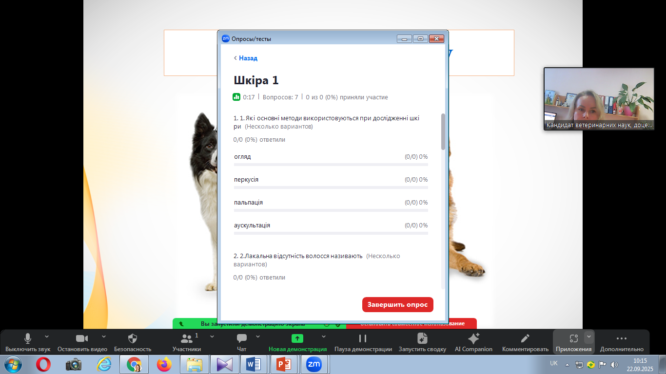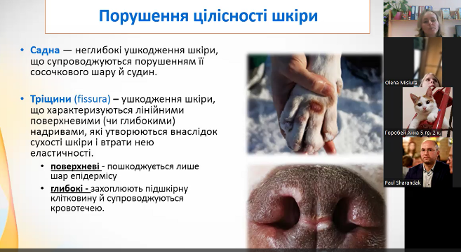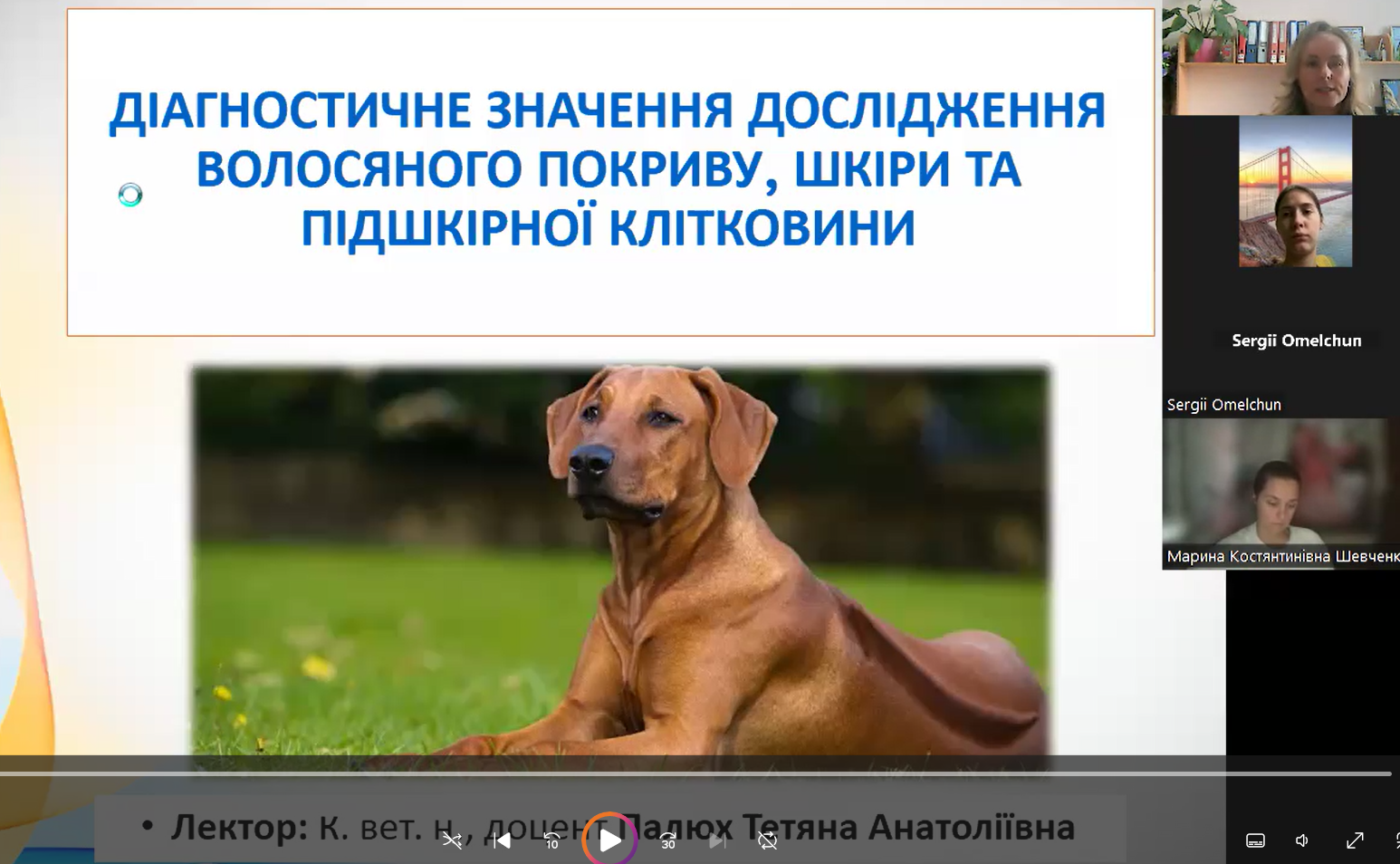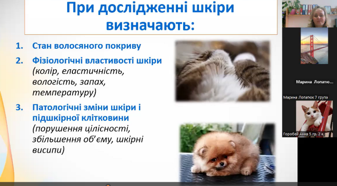 Згідно графіку проведення відкритих лекцій на факультеті ветеринарної медицини у І семестрі 2025-2026 навчального року, 18 вересня 2025 року проведена відкрита лекція, кандидатом ветеринарних наук, доцентом кафедри внутрішніх хвороб тварин Тетяною Анатоліївною Палюх з дисципліни «Клінічна діагностика хвороб тварин» для студентів 3 курсу ОС «Магістр» на тему: «Діагностичне значення дослідження волосяного покриву, шкіри та підшкірної клітковини». Лекція відбулася у дистанційному форматі на платформі Zoom.