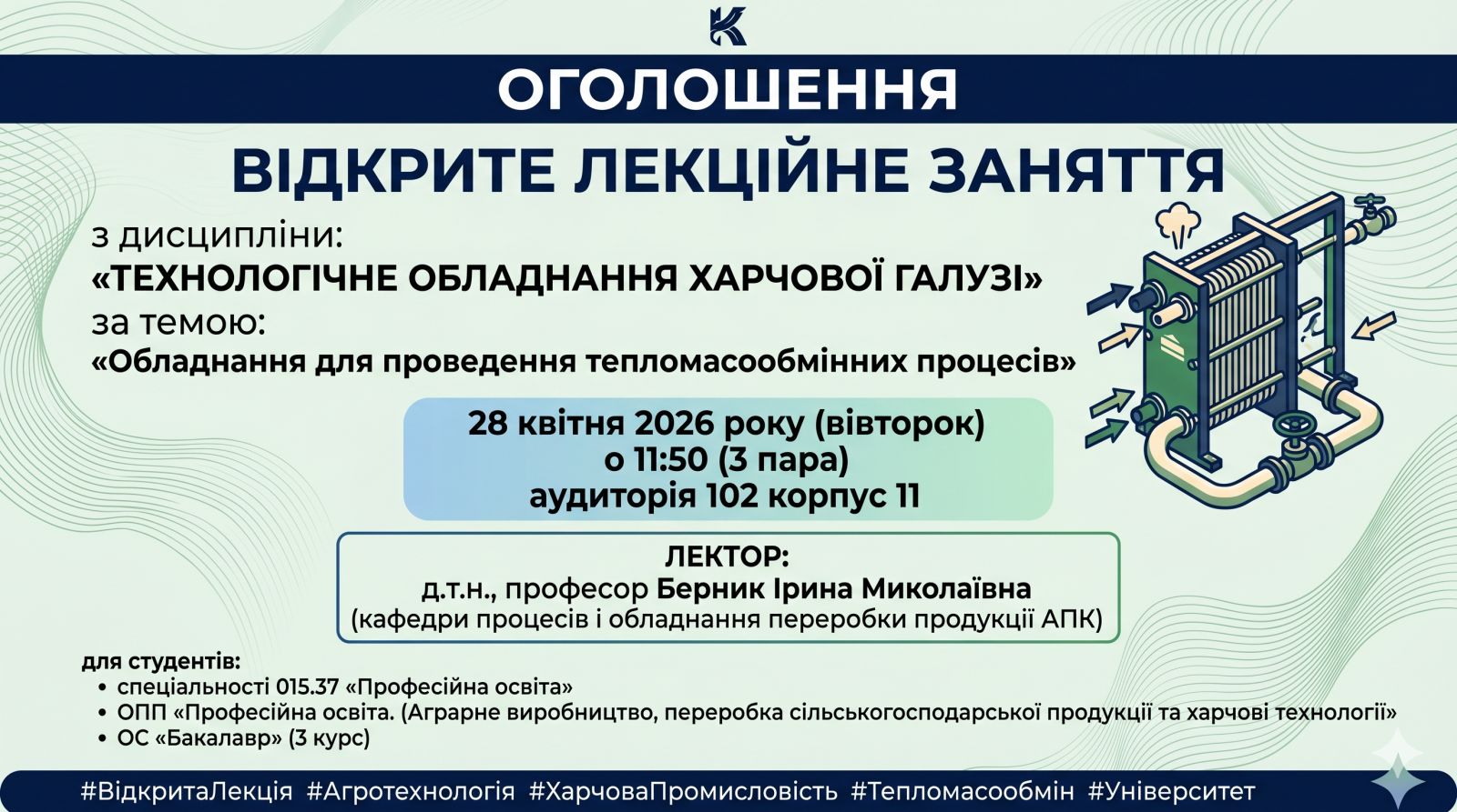 Відкрите лекційне заняття на тему "Обладнання для проведення тепломасообмінних процесів"