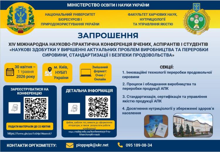 Додаткова інформація про конференцію міститься в запрошенні та на сайті: https://nubip.edu.ua/konferentsiyi-f-tu-kharchovykh-nauk