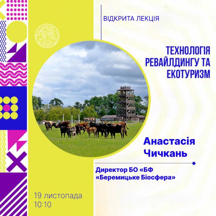 19 листопада 2025 року на кафедрі готельно-ресторанної справи та туризму відбудеться гостьова лекція з Анастасією Чичкань – директоркою БО «БФ «Беремицьке Біосфера». В контексті лекційної теми «Технологія ревайлдингу та екотуризм» спікерка познайомить здобувачів освіти з природоохоронною та туристичною діяльністю унікального парку природи «Беремицьке» на Чернігівщині.