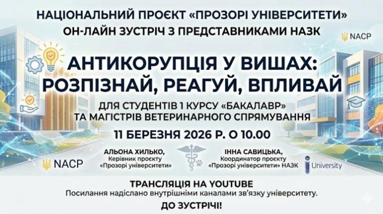 11 березня 2026 р. о 10:00 в рамках загальнодержавного проєкту «Прозорі університети» відбудеться он-лайн зустріч з представниками Національного агентства з питань запобігання корупції
