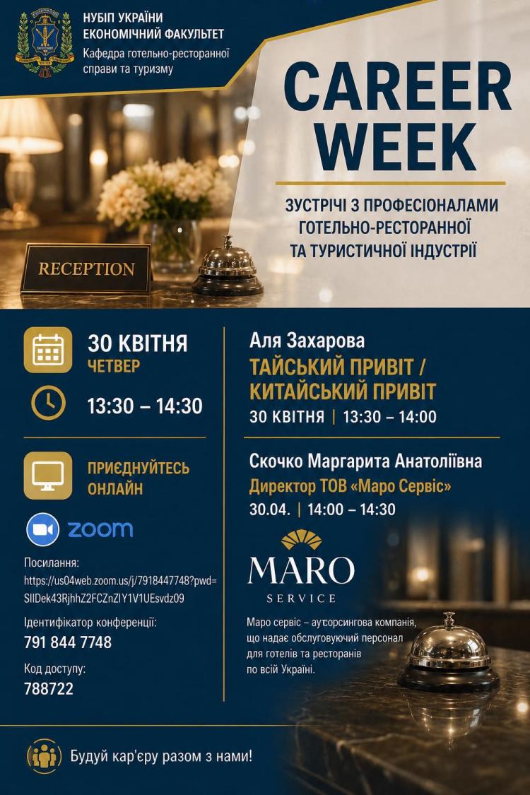 Кафедра готельно-ресторанної справи та туризму Економічного факультету НУБіП України запрошує здобувачів освіти взяти участь у зустрічах із професіоналами в рамках Career Week.