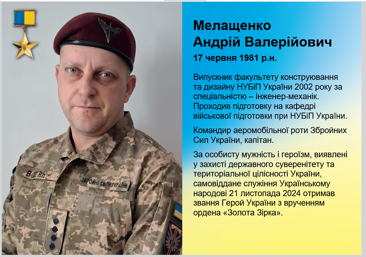 МЕЛАЩЕНКО Андрій Валерійович (нар. 17.06.1981 р., м. Бровари, Київська обл.). Випускник факультету конструювання та дизайну НУБіП України (у 2000 р. – бакалавр, у 2002 р. – магістр). В 2001–2002 рр. – навчався на кафедрі військової підготовки НУБіП України. Служить у 77-й окремій аеромобільній Наддніпрянській бригаді Десантно-штурмових військ ЗСУ. У листопаді 2023 р. спланував та безпосередньо брав участь у штурмових діях, у результаті яких було відбито три позиції поблизу селища Ягідне Бахмутського району Донецької області. У вересні 2024 р. керував штурмом раніше втрачених позицій на шахті «Південнодонбаська № 3» у місті Вугледар Волноваського району Донецької області. Під час одного з обстрілів зазнав поранення, однак продовжував керувати боєм до завершення операції та залишив позицію лише після виходу всіх підлеглих. Герой України (2024).