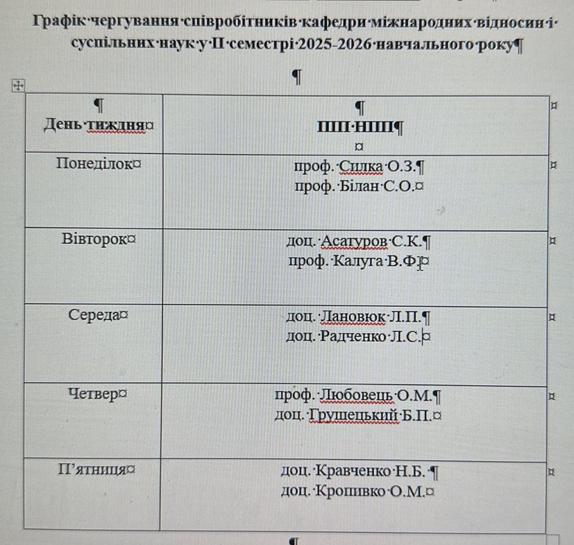 Графік чергування НПП кафедри МВіСН та розклад занять на І семестр 2025-2026 н.р.