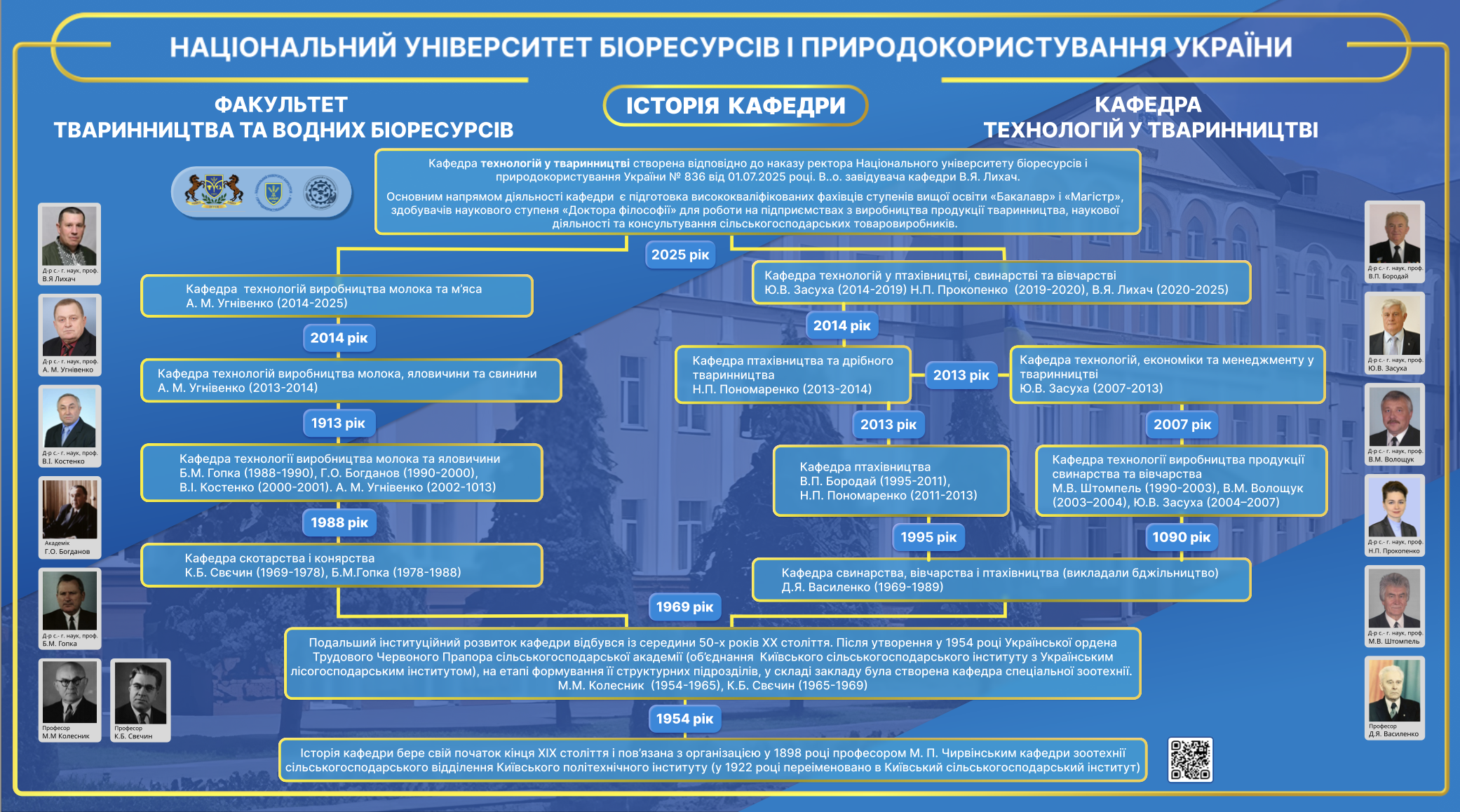 У 2025 році, у результаті об’єднання кафедри технологій у птахівництві, свинарстві та вівчарстві з кафедрою технологій виробництва молока та м’яса (разом з їх структурними підрозділами), відповідно до наказу ректора Національного університету біоресурсів і природокористування України №836 від 01.07.2025 р., створено кафедру технологій у тваринництві. Очолює кафедру доктор с.-г. н., професор Вадим Лихач.