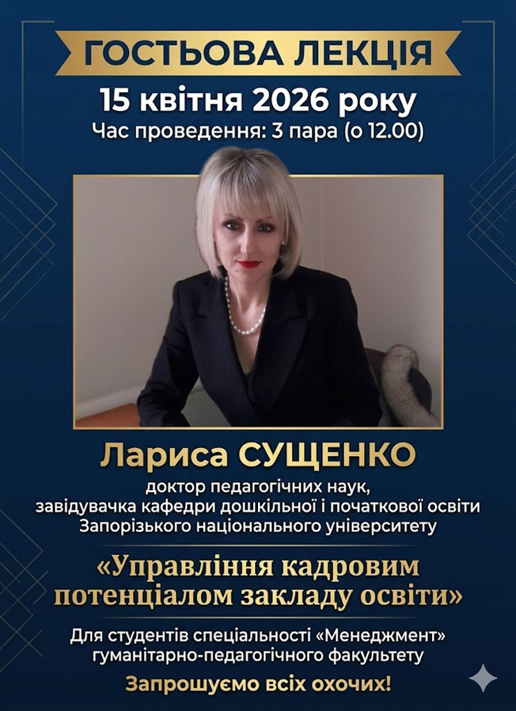 Запрошуємо на гостьову лекцію доктора педагогічних наук, завідувачки кафедри дошкільної і початкової освіти Запорізького національного університету Лариси СУЩЕНКО 15 квітня 2026 року 12:00 - 13:10