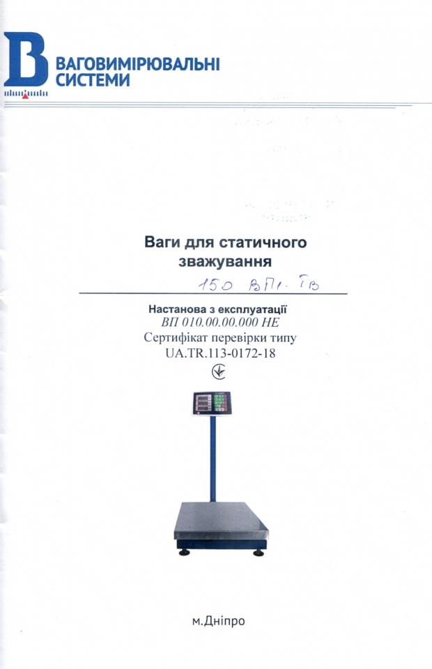 – ваги для статичного зважування 150 ВП1. ТВ (сертифікат перевірки типу UA.TR.113-0172-18, заводський №1396 (від 20.08.2020) (виготовлені відповідно до вимог ДСТУ EN 45501:2017, клас точності відповідно до ДСТУ EN 45501:2017 – середній, познака – III), 2020 р.;