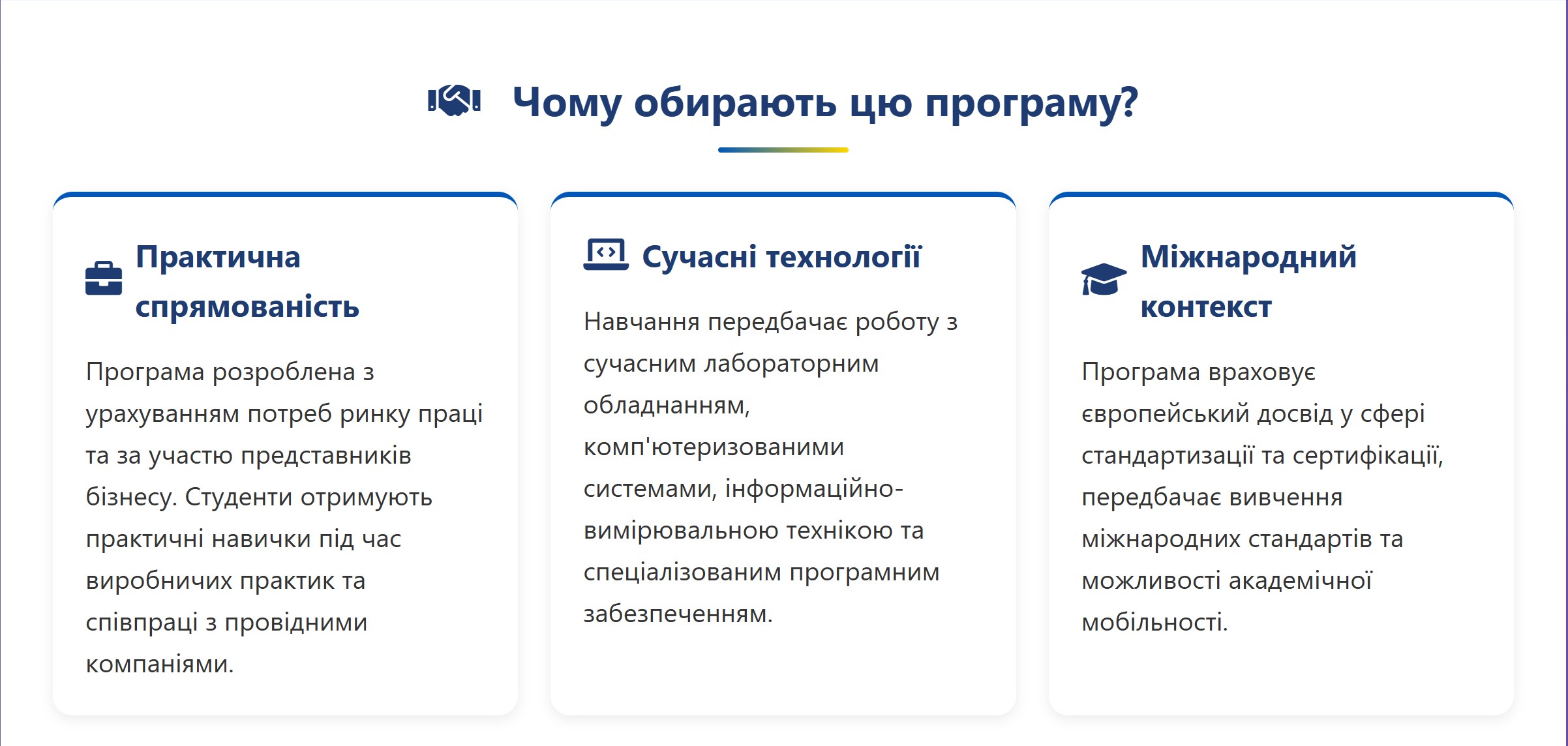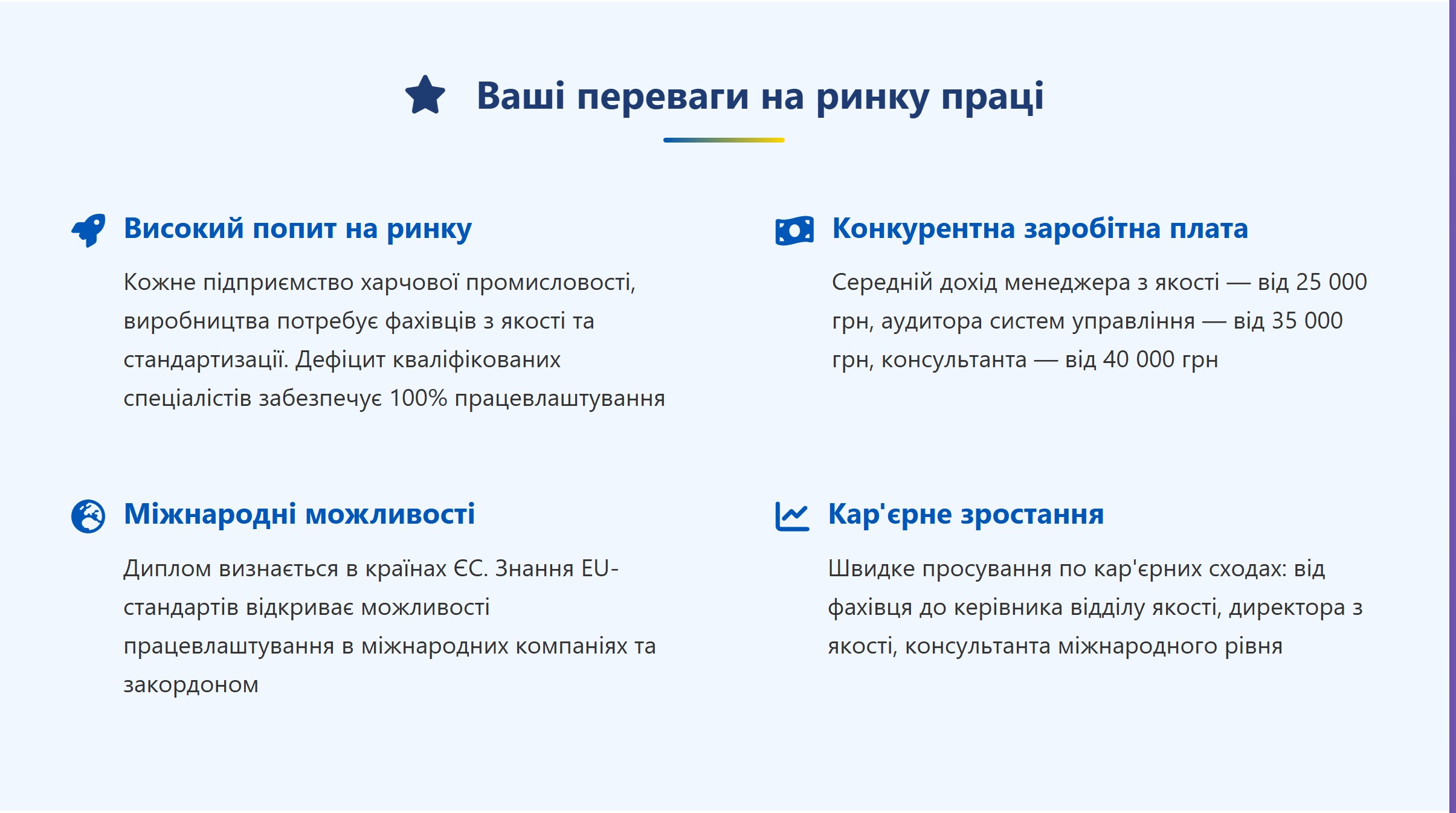 Ти прагнеш стати затребуваним фахівцем, який гарантує якість та безпечність продукції? Хочеш розбиратися у вітчизняних і міжнародних стандартах та керувати системами якості на провідних підприємствах? Тоді ця програма саме для тебе!