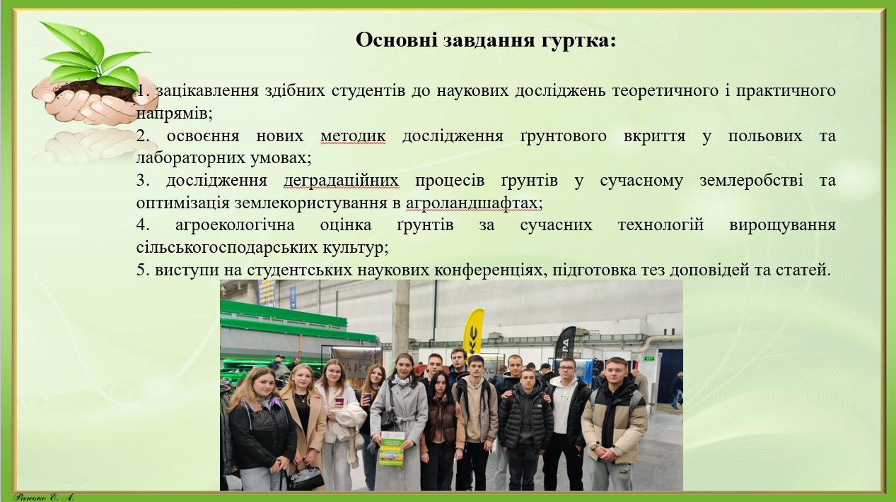 Мета: зацікавлення здібних студентів до наукових досліджень теоретичного і практичного напрямів щодо досліджень деградаційних процесів ґрунтів у сучасному землеробстві та оптимізації землекористування в агроландшафтах, а також освоєнні нових методик дослідження ґрунтового вкриття у польових та лабораторних умовах. сприяння, реалізація наукового та творчого потенціалу студентів-гуртківців кафедри ґрунтознавства та охорони ґрунтів ім. проф. М.К. Шикули.