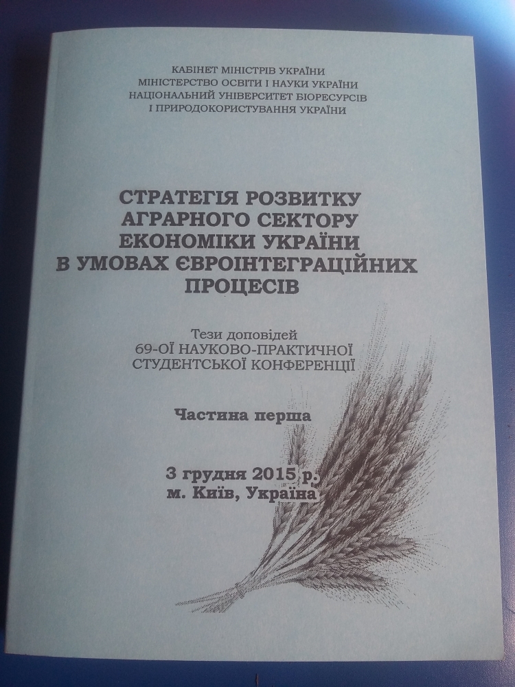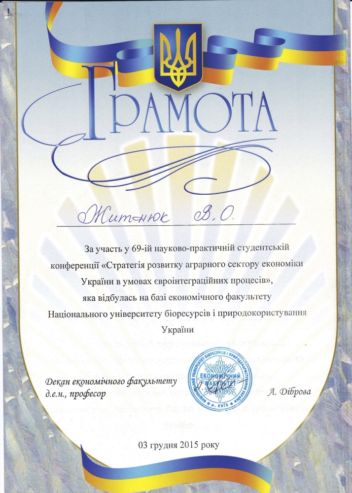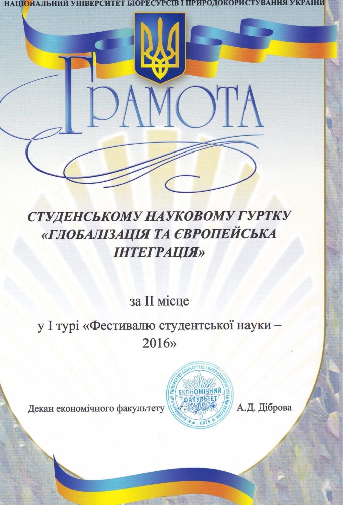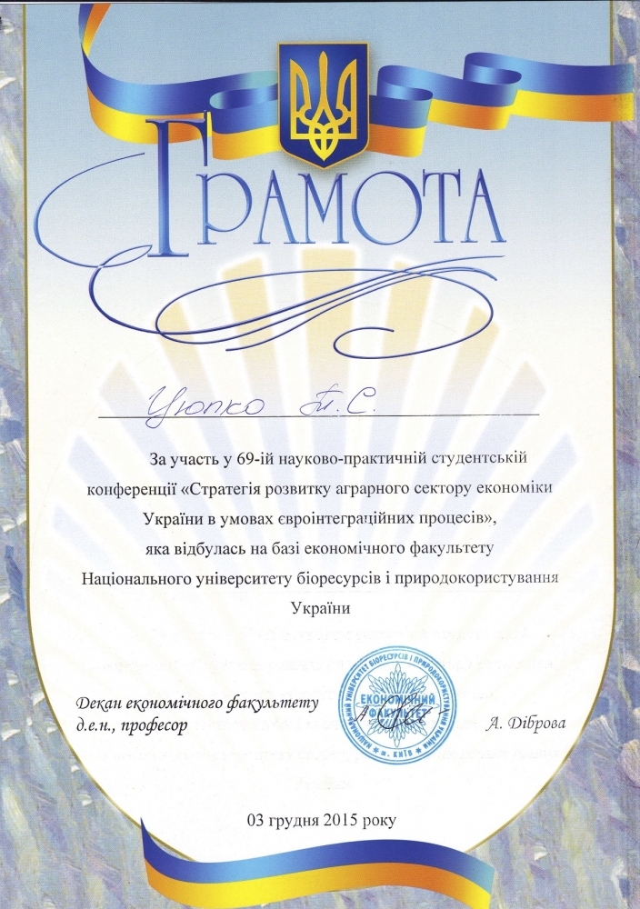 • Участь у 74-й науково-практичній студентській конференції: Концептуальні засади збалансованого розвитку аграрного сектору економіки України в умовах глобальних викликів: Розвиток аграрної політики України в умовах інтеграційних процесів.