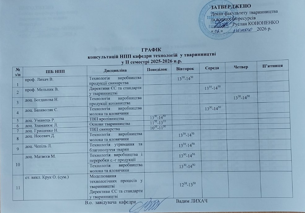 Співробітники кафедри є авторами типових навчальних програм з дисциплін: “Птахівництво та технологія виробництва яєць і м'яса птиці”, “Технологія виробництва продукції птахівництва”, “Технологія виробництва продукції свинарства”, “Селекція сільськогосподарських птахів”, “Виробництво і переробка продукції вівчарства та козівництва”, “Основи тваринництва“, “Технологія виробництва, переробки та зберігання сільськогосподарської продукції“.