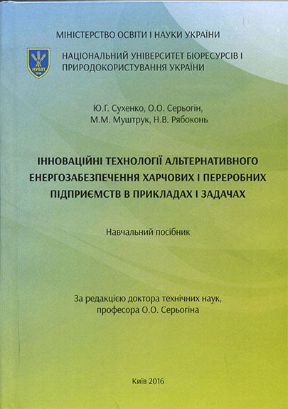 - Сухенко Ю.Г., Серьогін О.О., Муштрук М.М., Рябоконь Н.В. Інноваційні технології альтернативного енергозабезпечення харчових і переробних підприємств в прикладах і задачах: Навчальний посібник. – К. ЦП «КОМПРИНТ», 2016. – 256 с.
