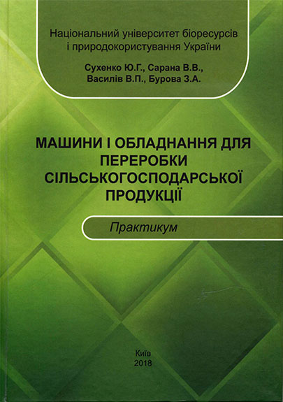 - Машини і обладнання для переробки сільськогосподарської продукції / Ю.Г Сухенко, В.В. Сарана, В.П. Василів, Бурова З.А. Практикум [Навчальний посібник] / За ред. проф. Ю.Г. Сухенка. – К.: ЦП "Компринт", 2018. – 589 с.